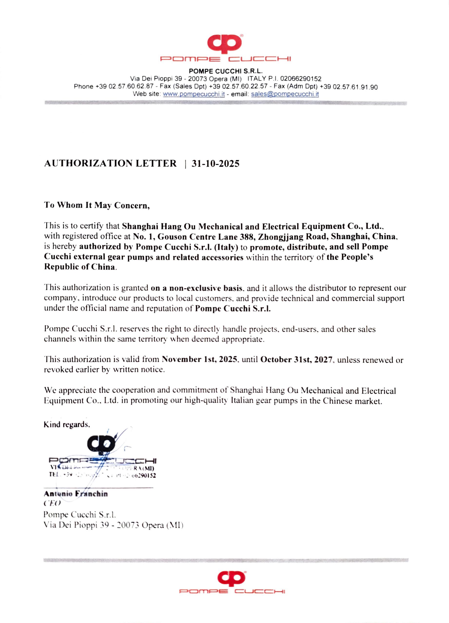 2025年意大利Pompe Cucchi工厂授权上海航欧代理商