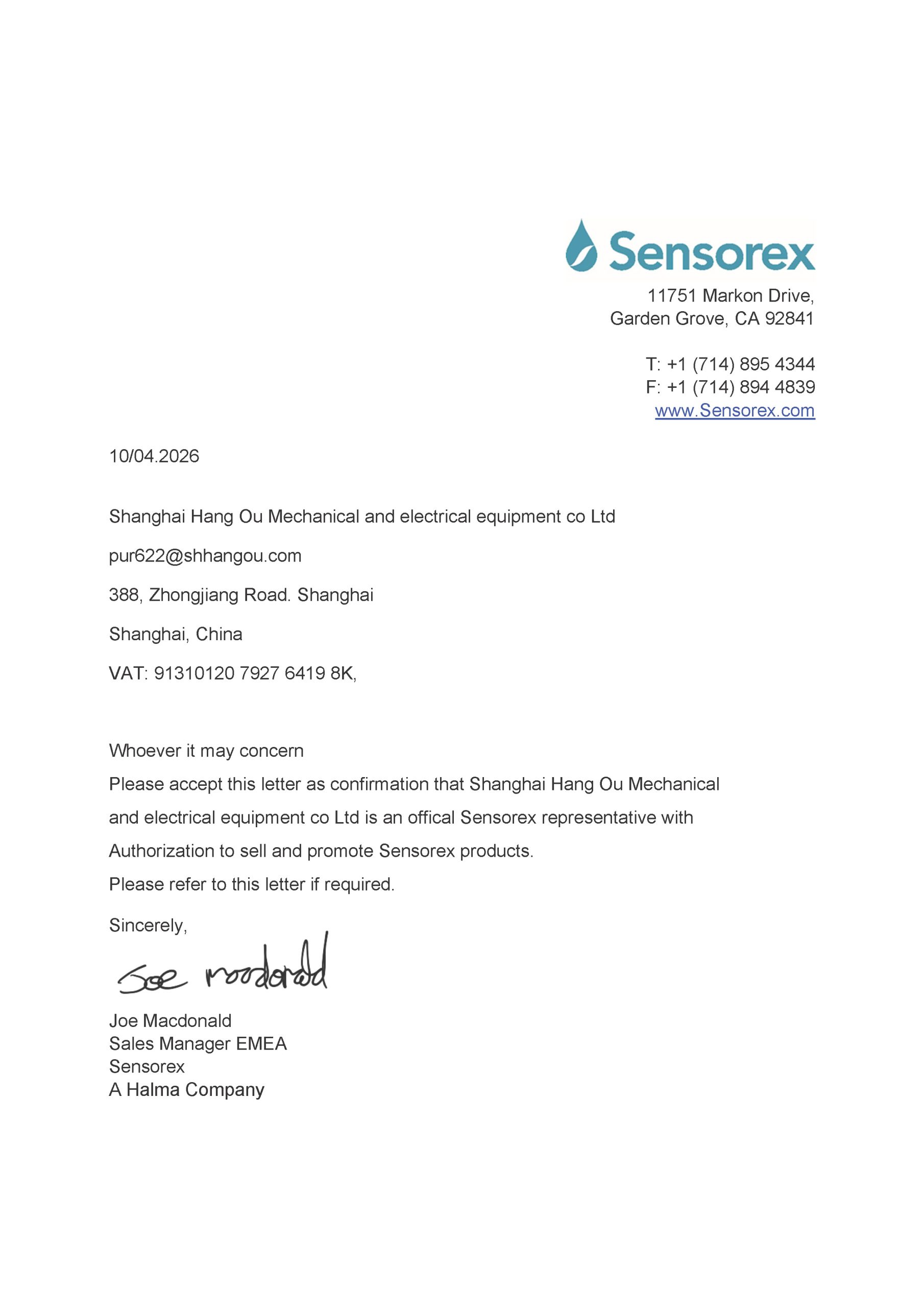 上海航欧机电设备有限公司 > 新闻中心 > 公司新闻 > 2026年美国sensorex工厂授权上海航欧中国区代理